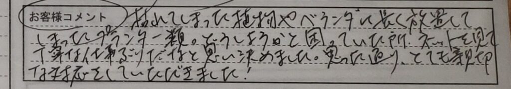 「枯れてしまった植木やベランダに長く放置してしまっまたプランター類をどうしようかと困っていたところ、ネットを見て丁寧な仕事ぶりだなと思い決めました。思った通りとても親切な対応していただきました。」